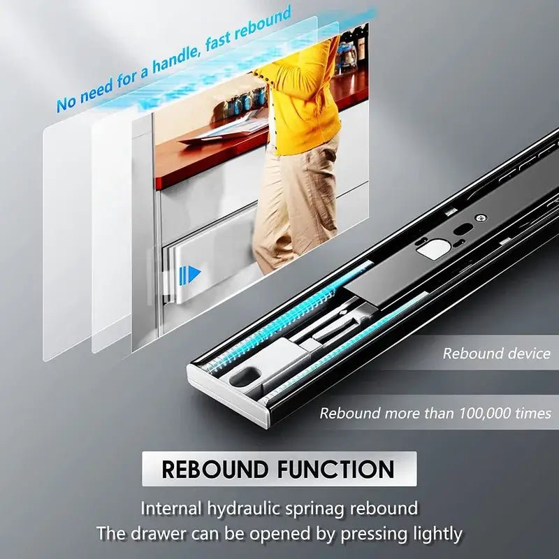 - 【Push Open & Detachable】This is push to open drawer runner ,no need to pull hands.The drawer rebounds and slides open as soon as you touch it,There is a black plastic buckle on the back of the slide rail, and the drawer can be easily taken out by pressing it, Easy to install